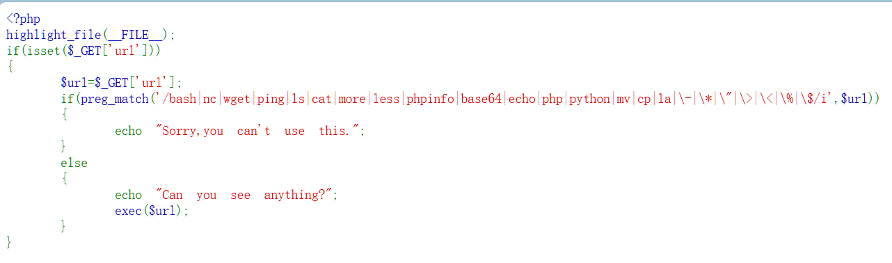 先看if里的内容,preg_match 函数用于执行一个正则表达式匹配,末尾的/i说明 匹配不分大小写。读了代码后发现反斜杠和单引号都没有被注释掉,那么我们就可以利用这一点来绕过被禁止掉的命令当正则表达式没有过滤掉反斜杠或者单引号或者双引号,那么可以使用单引号或者双引号包裹命令(如:ls cat等)任意一个字符,只要他们不是一个整体就行,或者使用反斜杠插入到命令里面(如:ca\t c\at等)即可实现绕过可以看到的是没有过滤”|“这个符号,然后exec执行是没有回显的.