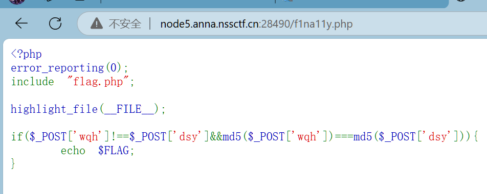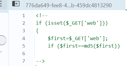 查找网页源代码,发现这一段PHP代码,这个考的应该是md5绕过