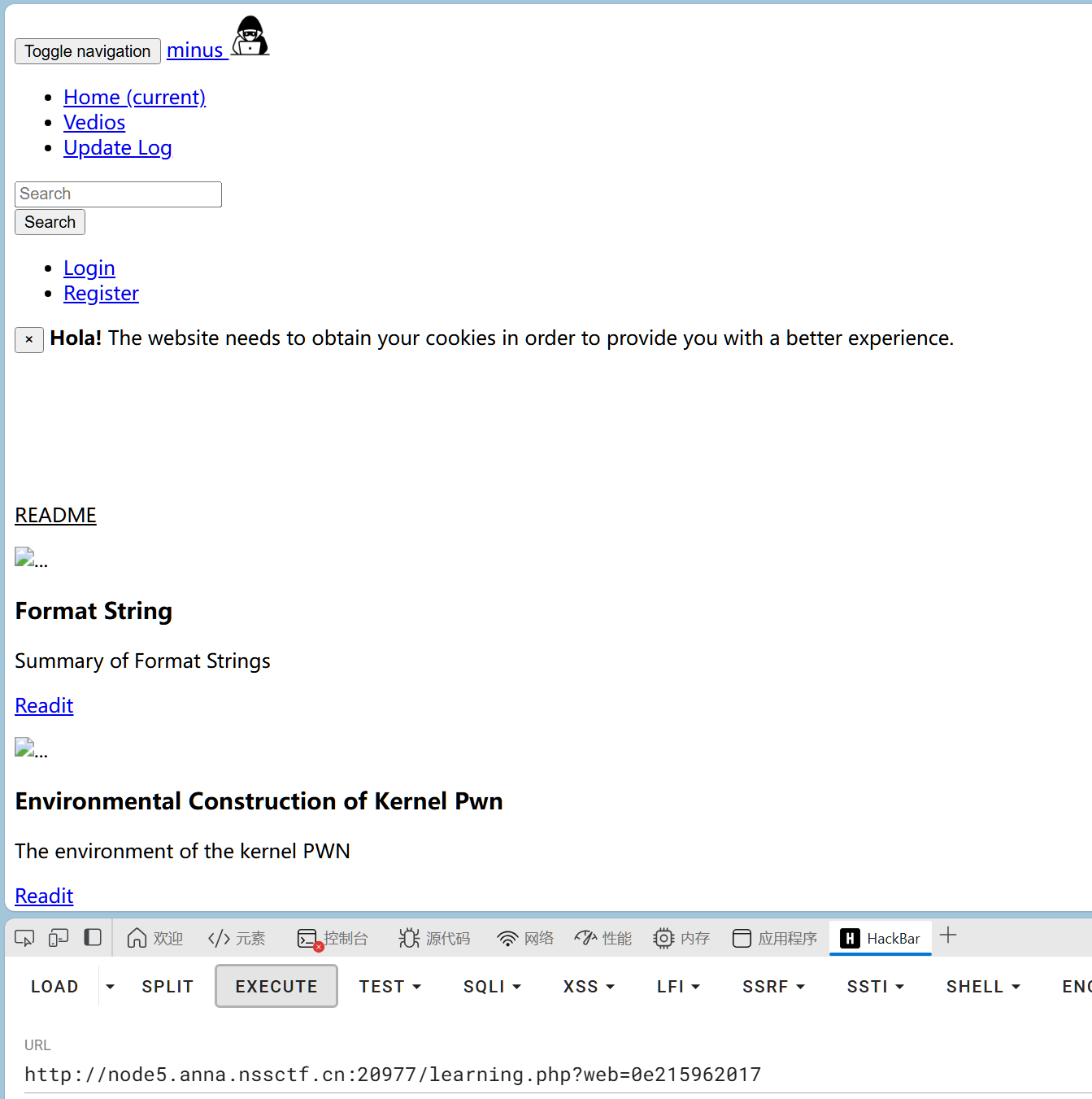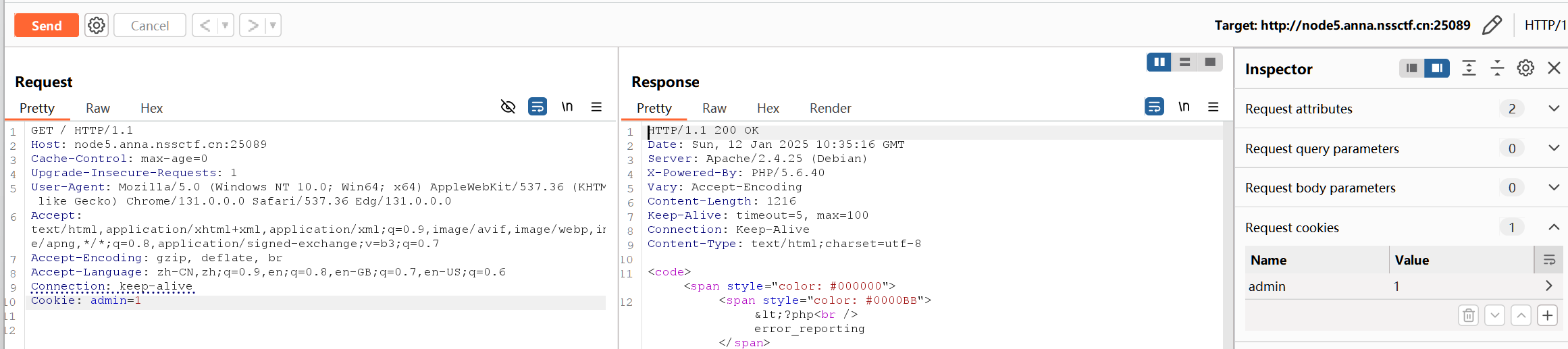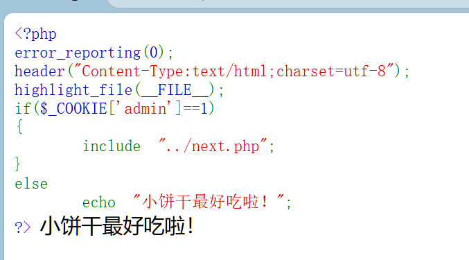 如果’admin’ 的 cookie 值是否为1。如果是,它将包含(include)”../next.php” 文件,所以把请求中Cookie的值设置为1就可以拿到flag了