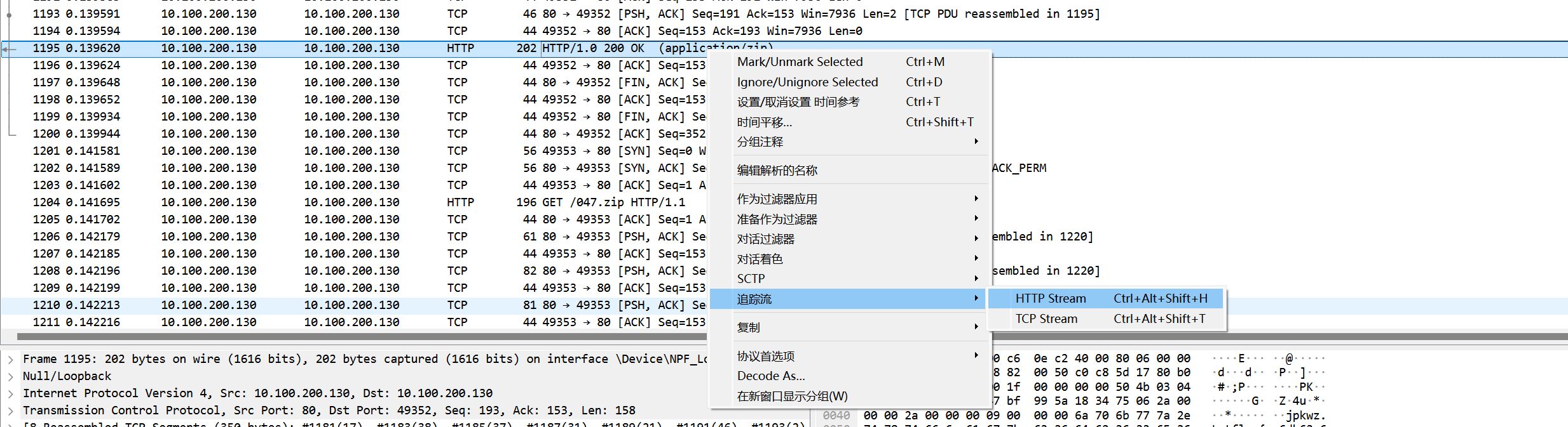这一题真的有点废时间,我一开始从头看到尾都没有结果,甚至随便找了给压缩包就尝试解压,发现不行,有看一下这个是个比较简单的题目,应该直接找就行了,观察length不同的就行了,真的需要耐心。结果是202的不一样,位置在第46个压缩包,其他的都是196和260等干扰选项。然后用追踪流http打开这个就行了