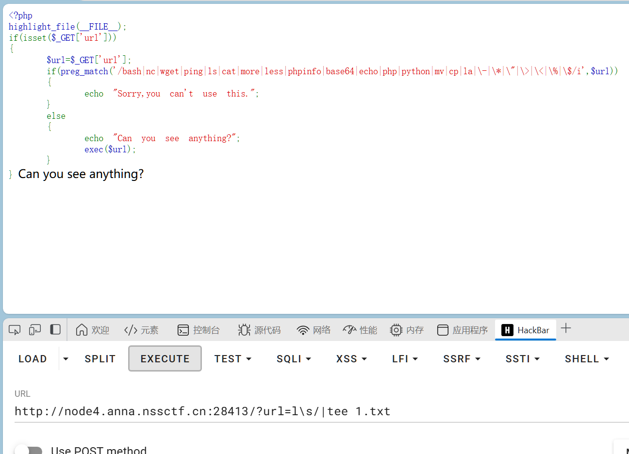 先看if里的内容,preg_match 函数用于执行一个正则表达式匹配,末尾的/i说明 匹配不分大小写。读了代码后发现反斜杠和单引号都没有被注释掉,那么我们就可以利用这一点来绕过被禁止掉的命令当正则表达式没有过滤掉反斜杠或者单引号或者双引号,那么可以使用单引号或者双引号包裹命令(如:ls cat等)任意一个字符,只要他们不是一个整体就行,或者使用反斜杠插入到命令里面(如:ca\t c\at等)即可实现绕过可以看到的是没有过滤”|“这个符号,然后exec执行是没有回显的.