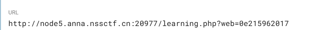 奇妙的字符串,又跟 MD5 有关,查了资料,找到了两个:一个是 MD5 加密后弱比较等于自身,这个字符串是 0e215962017 :