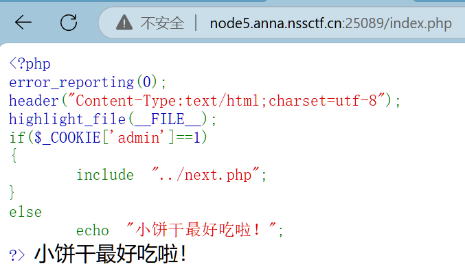 如果’admin’ 的 cookie 值是否为1。如果是,它将包含(include)”../next.php” 文件,所以把请求中Cookie的值设置为1就可以拿到flag了