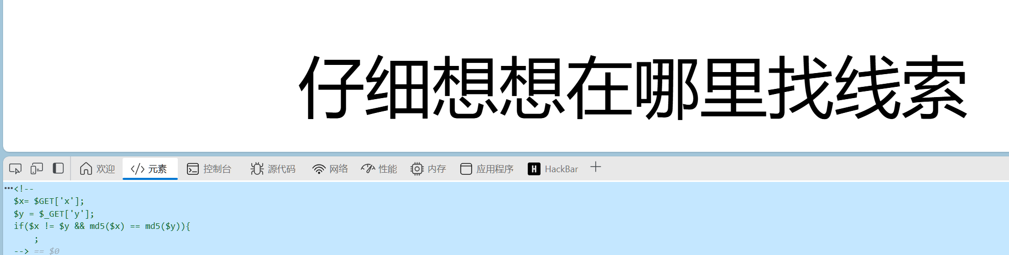查找网页源代码,发现这一段PHP代码,这个考的应该是md5绕过